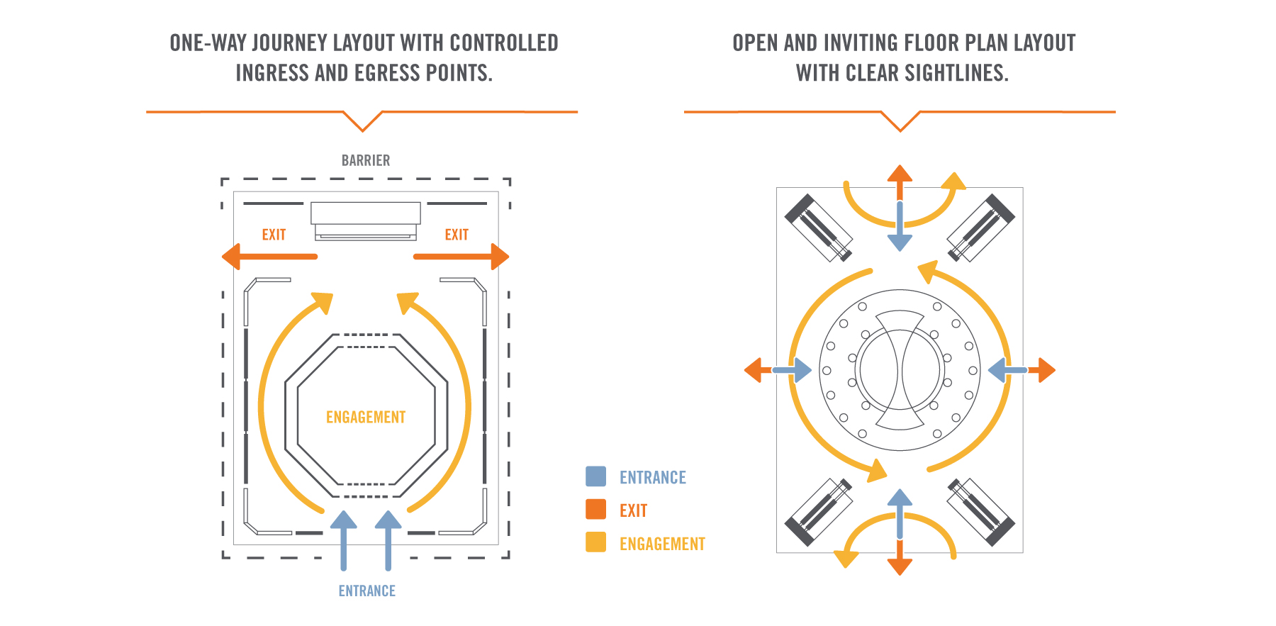 We recommend creating clear pathways through your exhibit space, creating a one-way journey if possible. Here are two examples of how a one-way journey can be accomplished: