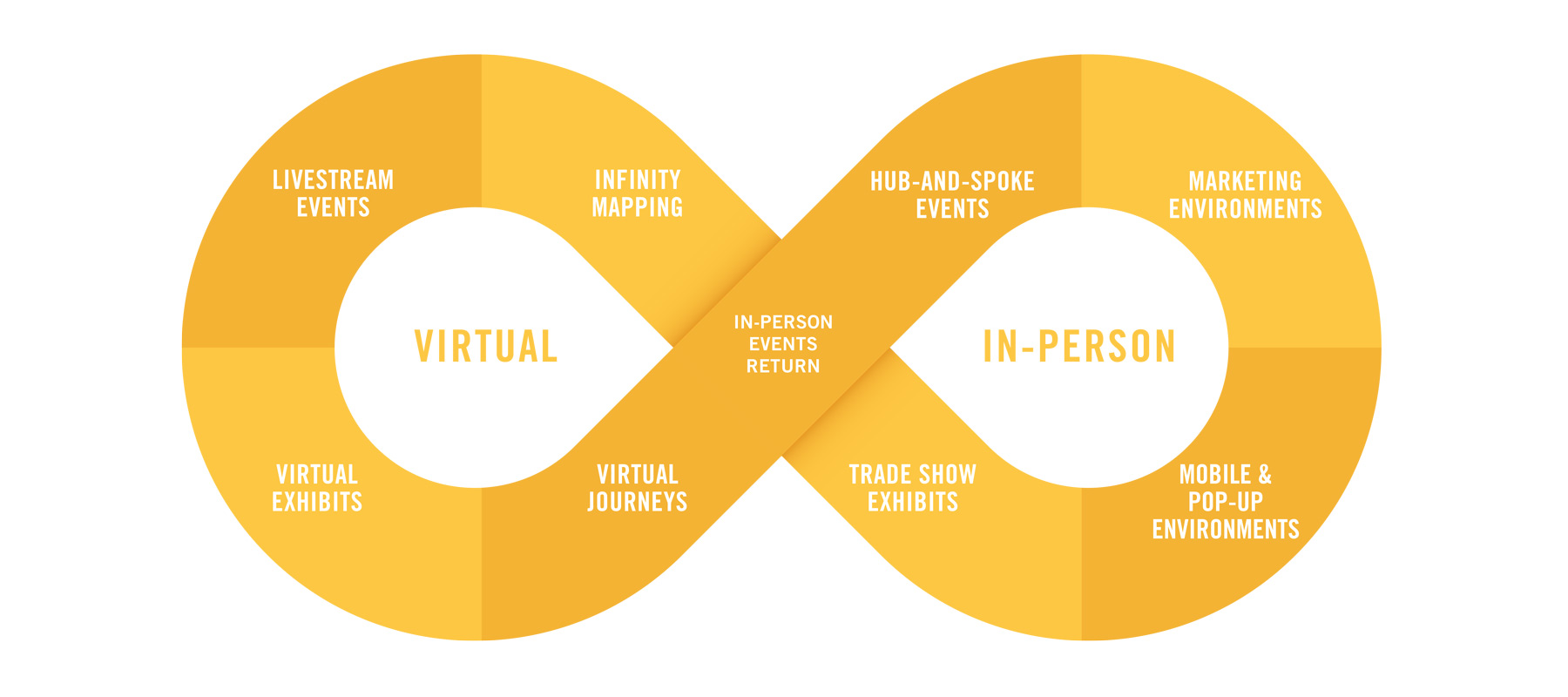 This hybrid engagement strategy is what we call The Infinity Loop. It’s essentially a customer journey bridging people-focused online experiences and a safe return to face-to-face events.
