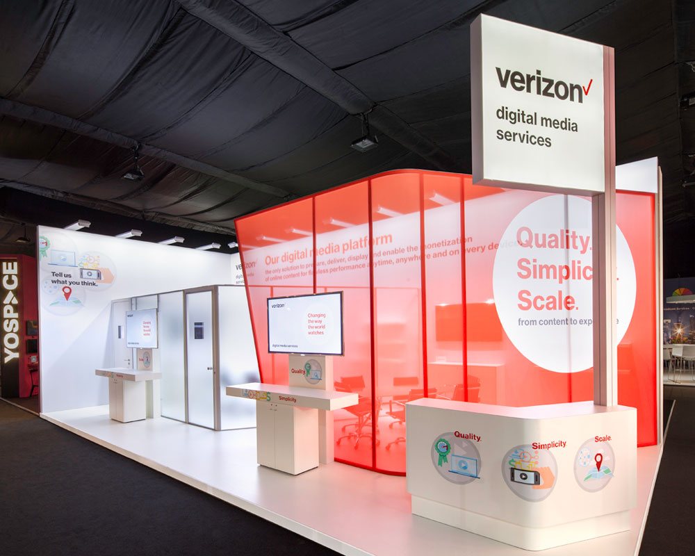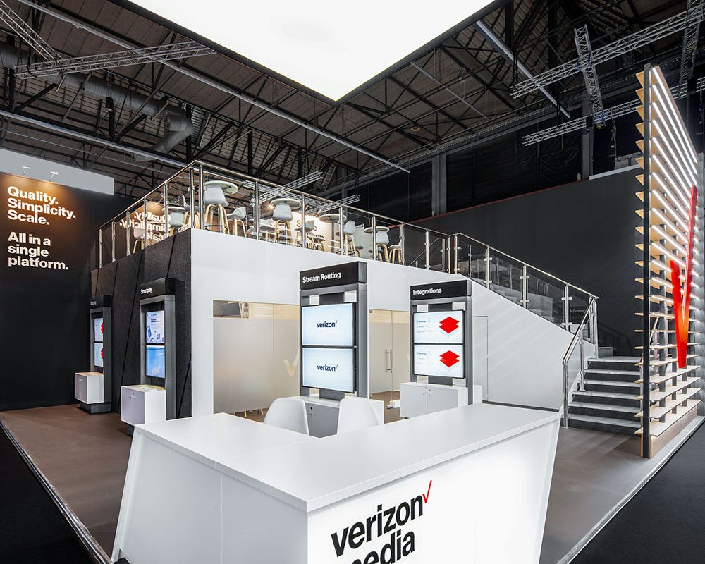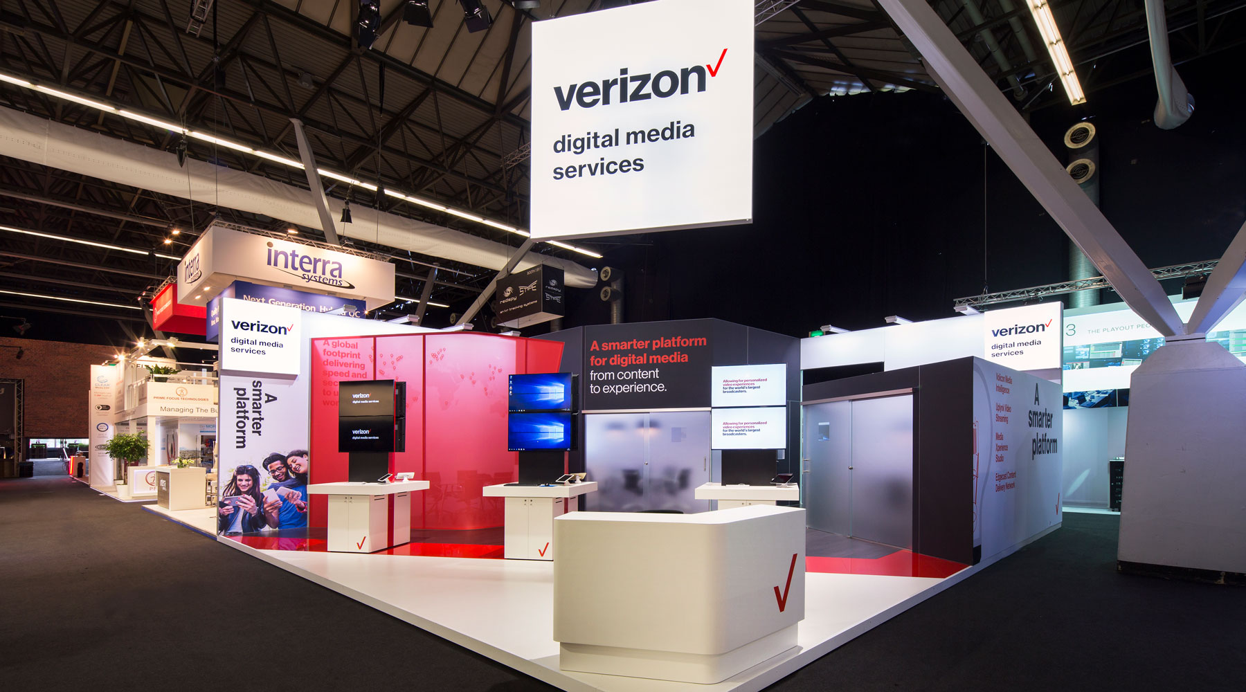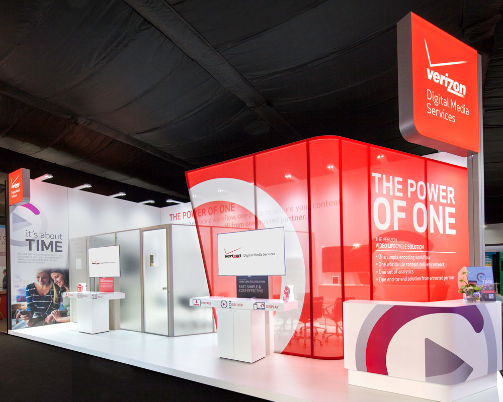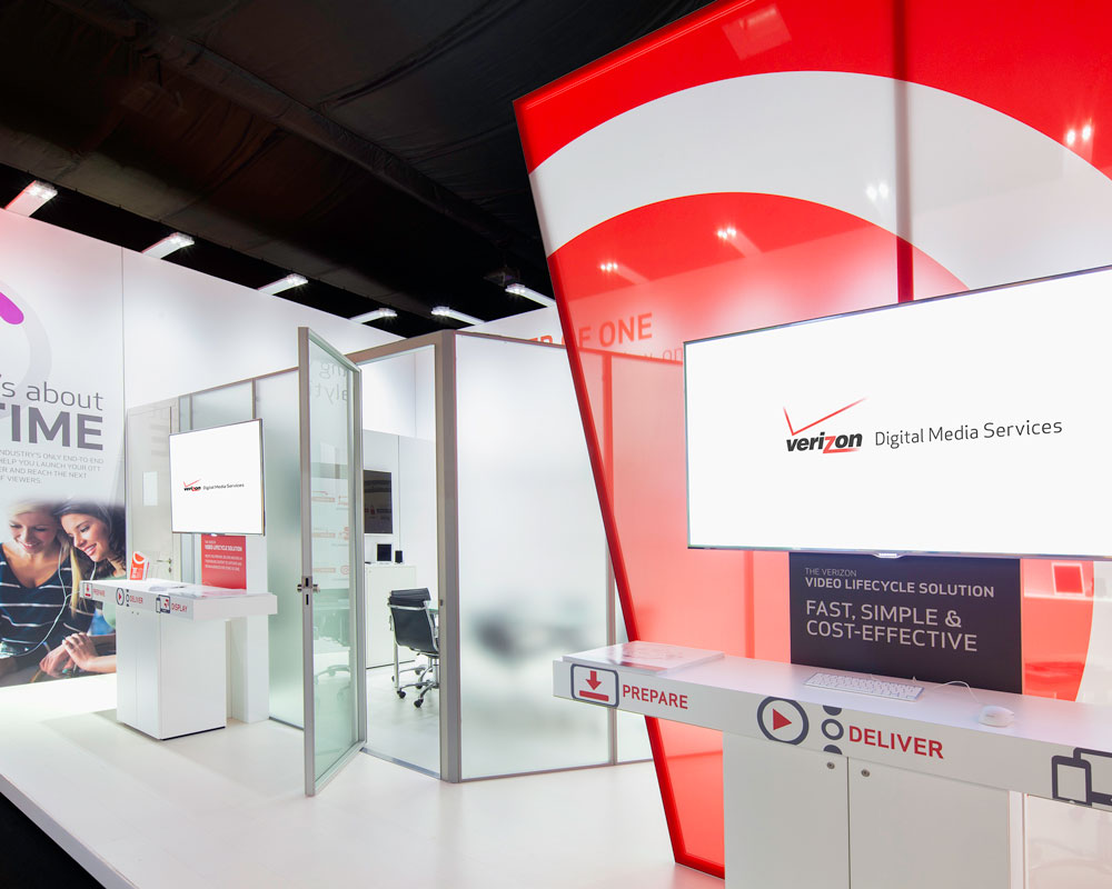 For IBC 2017, Verizon dramatically increased their booth size to 10m x 11m, meaning a new booth environment, design and components. Derse’s designer evaluated the custom components from previous years and incorporated rental properties into a new exhibit for debut. With Derse’s vast partners, we were able to obtain multiple quotes in various countries to find the most cost-efficient partner with regard to materials, labor, location and shipping.